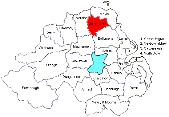 | Ballymena | Ballymoney | Banbridge | Belfast | Carrickfergus | Castlereagh | Coleraine | Cookstown | Craigavon | Derry | Down