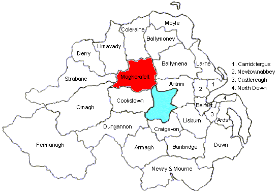 | Ballymena | Ballymoney | Banbridge | Belfast | Carrickfergus | Castlereagh | Coleraine | Cookstown | Craigavon | Derry | Down