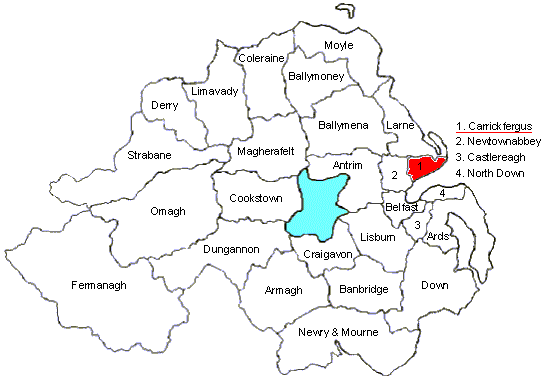 1989: Antrim | Ards | Armagh | Ballymena | Ballymoney | Banbridge | Belfast | Carrickfergus | Castlereagh | Coleraine | Cookstown | Craigavon | Derry | Down | Dungannon | Fermanagh | Larne | Limavady | Lisburn | Magherafelt | Moyle | Newry and Mourne | Newtownabbey | North Down | Omagh | Strabane
