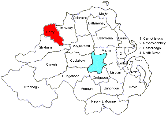 Antrim | Ards | Armagh | Ballymena | Ballymoney | Banbridge | Belfast | Carrickfergus | Castlereagh | Coleraine | Cookstown | Craigavon | Derry | Down | Dungannon | Fermanagh | Larne | Limavady | Lisburn | Magherafelt | Moyle | Newry and Mourne | Newtownabbey | North Down | Omagh | Strabane