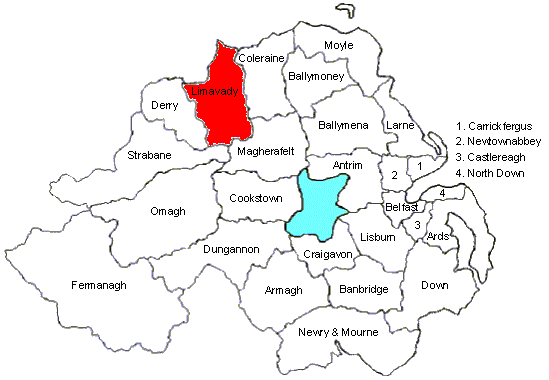 | Castlereagh | Coleraine | Cookstown | Craigavon | Derry | Down