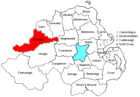 | Ballymena | Ballymoney | Banbridge | Belfast | Carrickfergus | Castlereagh | Coleraine | Cookstown | Craigavon | Derry | Down