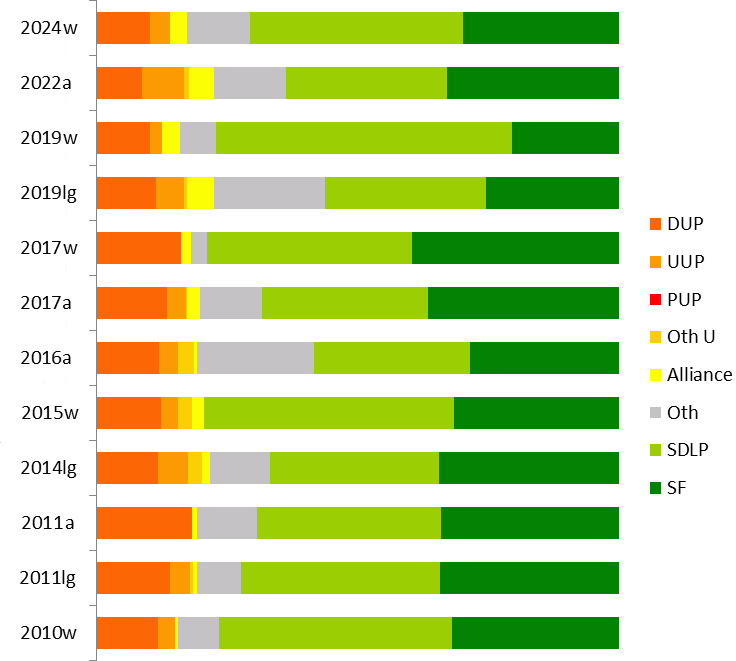 | DUP | UUP | Oth U | Alliance | Oth | SDLP | SF | |
