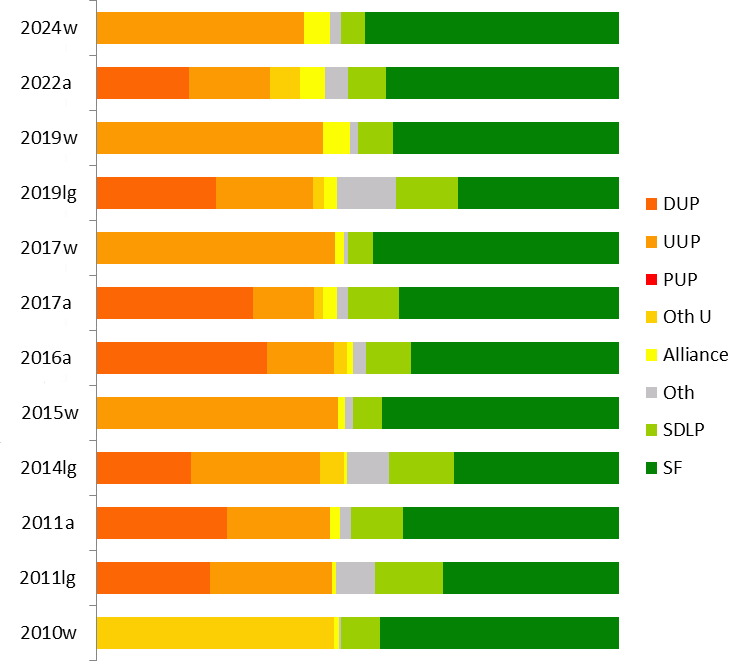 | DUP | UUP | Oth U | Alliance | Oth | SDLP | SF | |