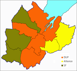Votes by Party: DUP 2,467 (26.8%) 2 seats SDLP 2,119 (23.0%) 1 seat Alliance 1,842 (20.0%) 1 seat SF 1,283 (13.9%) 1 seat UUP 660 (7.2%) Green 504 (5.5%) PBP 202 (2.2%) UKIP 133 (1.4%) |