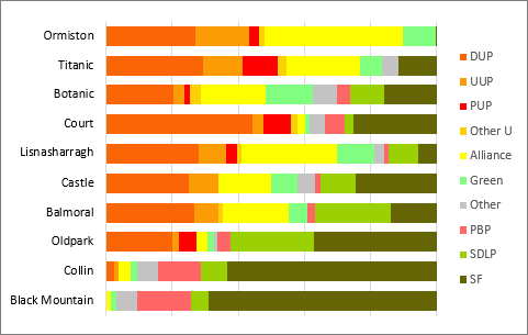 Votes by Party: Alliance 5,551 (41.8%) 3 seats - best Alliance result of the election DUP 3,588 (27.0%) 2 seats UUP 2,173 (16.4%) 1 seat Green 1,301 (9.8%) 1 seat PUP 394 (3.0%) UKIP 221 (1.7%) SF 57 (0.4%) |